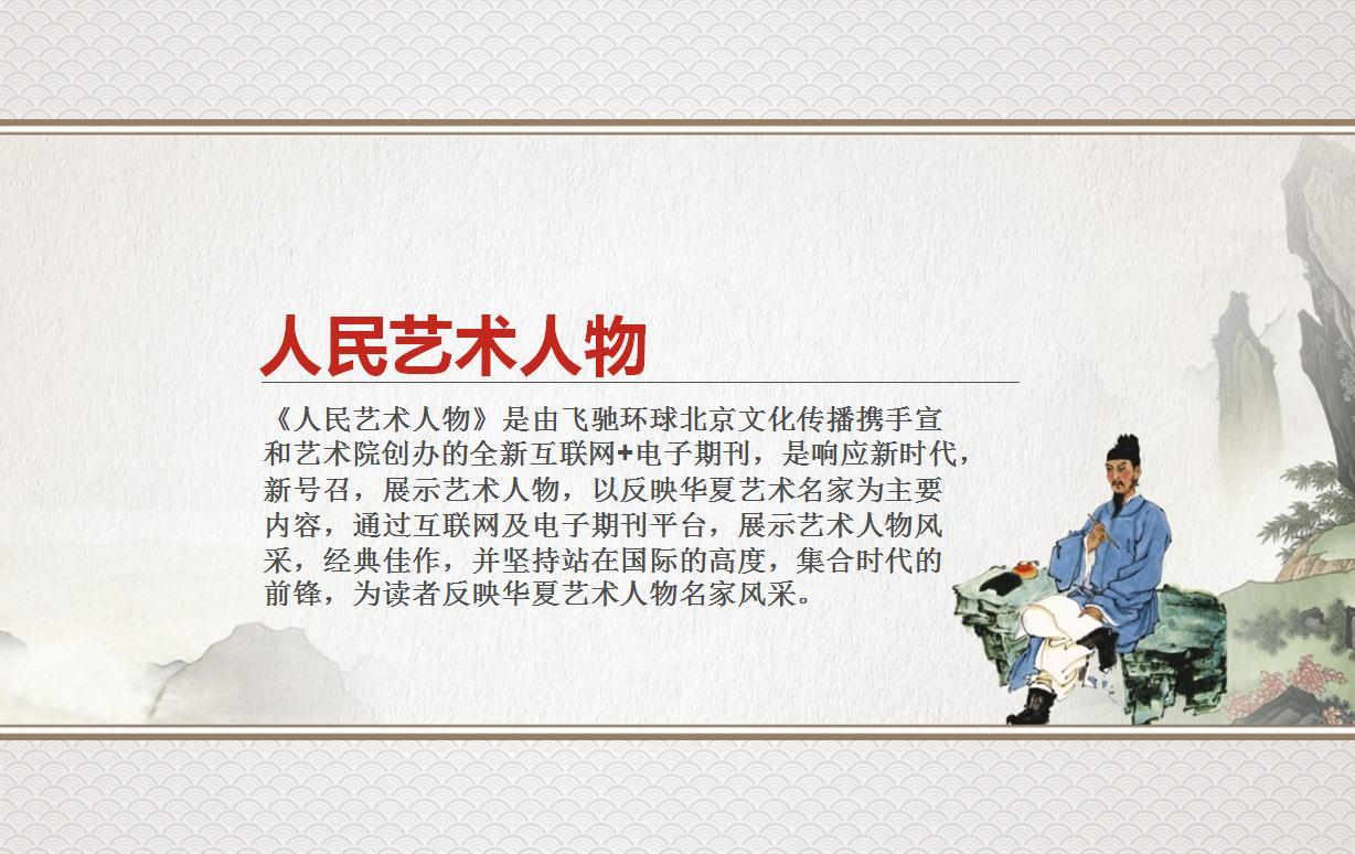 《人民艺术人物》是由飞驰环球北京文化传播携手宣和艺术院创办的全新互联网+电子期刊,是响应新时代,新号召,展示艺术人物,以反映华夏艺术名家为主要内容,通过互联网及电子期刊平台,展示艺术人物风采,经典佳作,并坚持站在国际的高度,集合时代的前锋,为读者反映华夏艺术人物名家风采。每一期电子杂志,都是我们精心筛选的具有新时代代表性的艺术人物。一步步走来,《人民艺术人物》得到了越来越多读者的认可,也得到了越来越广泛的客户支撑。