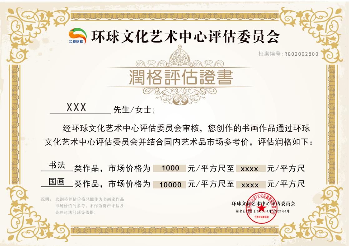 【环球文化艺术中心润格评估证书】